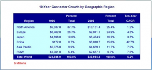 中國連接器的市場發(fā)展再次證明中國是世界工廠. 附表是全球各大區(qū)域連接器市場統(tǒng)計